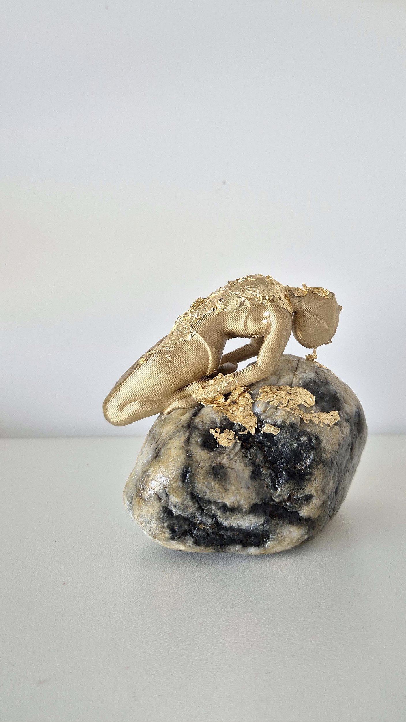 dimensão da obra 10x6x9cm; pedra de rio com escultura impressa com tecnologia 3D com acabamento em dourado e folha de ouro.