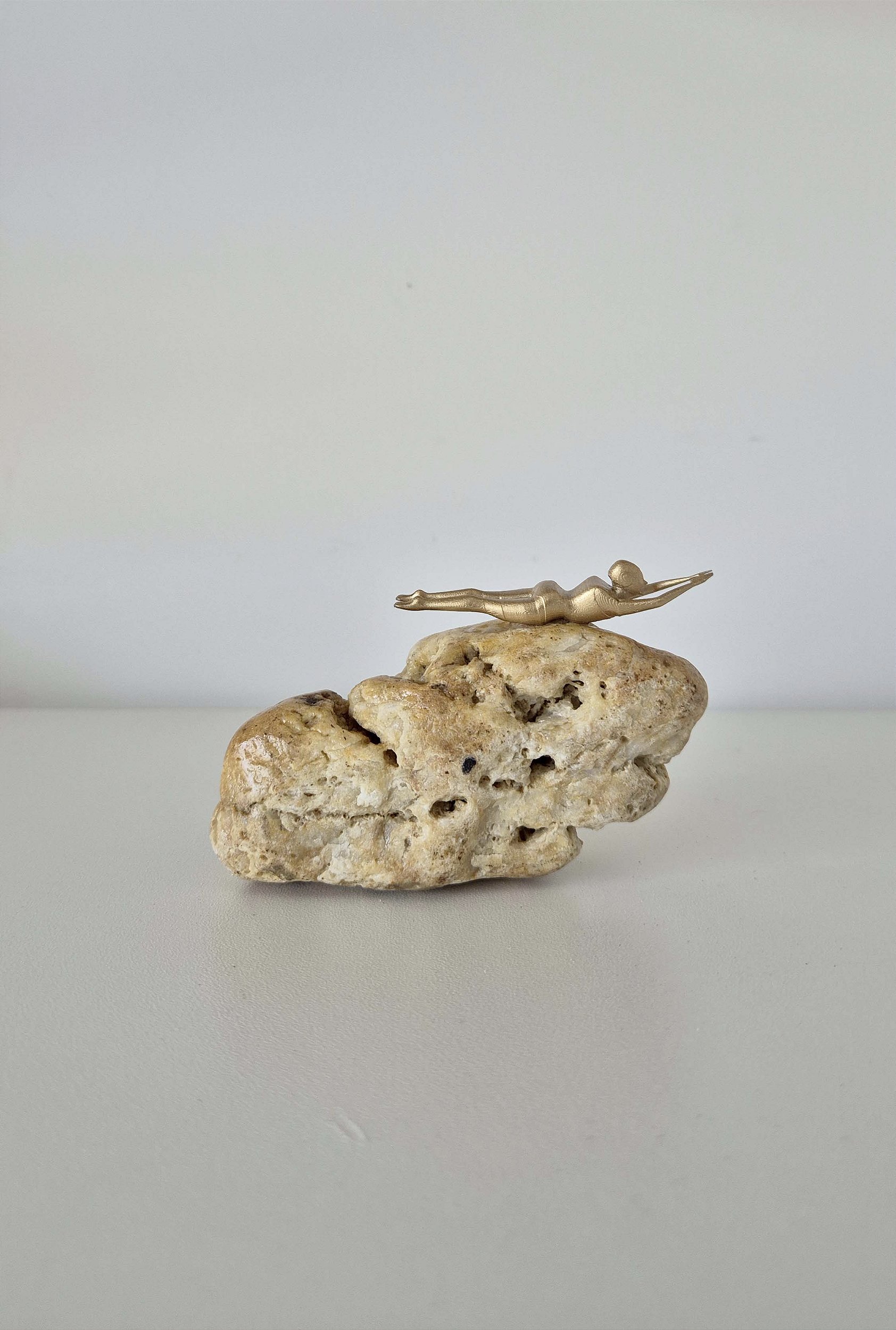 sou água que corre entre pedras é uma série que é trabalhada na sobreposição de pedras de rio com esculturas. Cada uma traz uma poesia, uma história, sobre a água que corre, dentro e fora de nós. Na perspectiva de que somos fluídos. Somos rios. Que nascem no alto, correm e não temem o oceano. Somos água. E cada gota é também oceano. No processo de criação me deparei algumas poesias de Manoel de Barros. E de falas e trechos surgiu o nome da série. E também o nome de algumas das obras que a compõe.