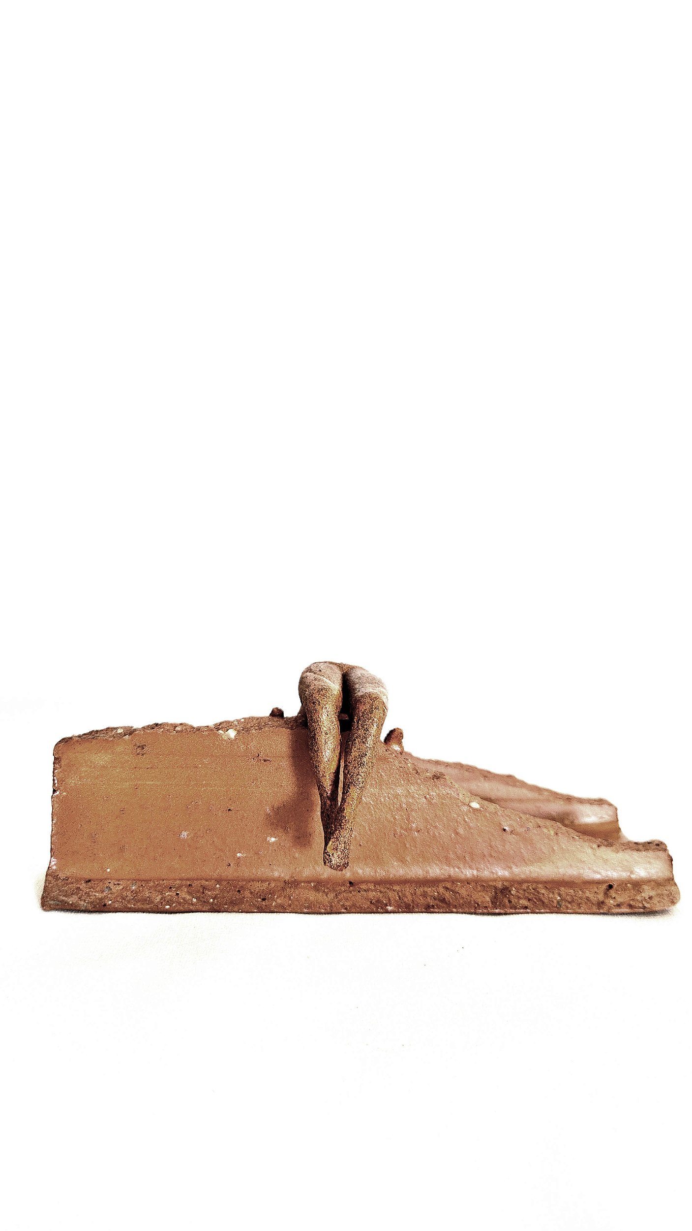 Obra que faz parte da série TELHA, TETO, AFETO. Uma série de obras originais e únicas, criadas a partir da ressignificação de matérias encontradas nas areias do litoral do Sul do Brasil. E esculturas que, em seus processos de produção, apresentaram algum defeito. Uma série que fala de reaproveitamento, se torna um ato de transformar e provocar uma nova perspectiva sobre descartes e pedaçoes de lares que são trazidos pelos mares.