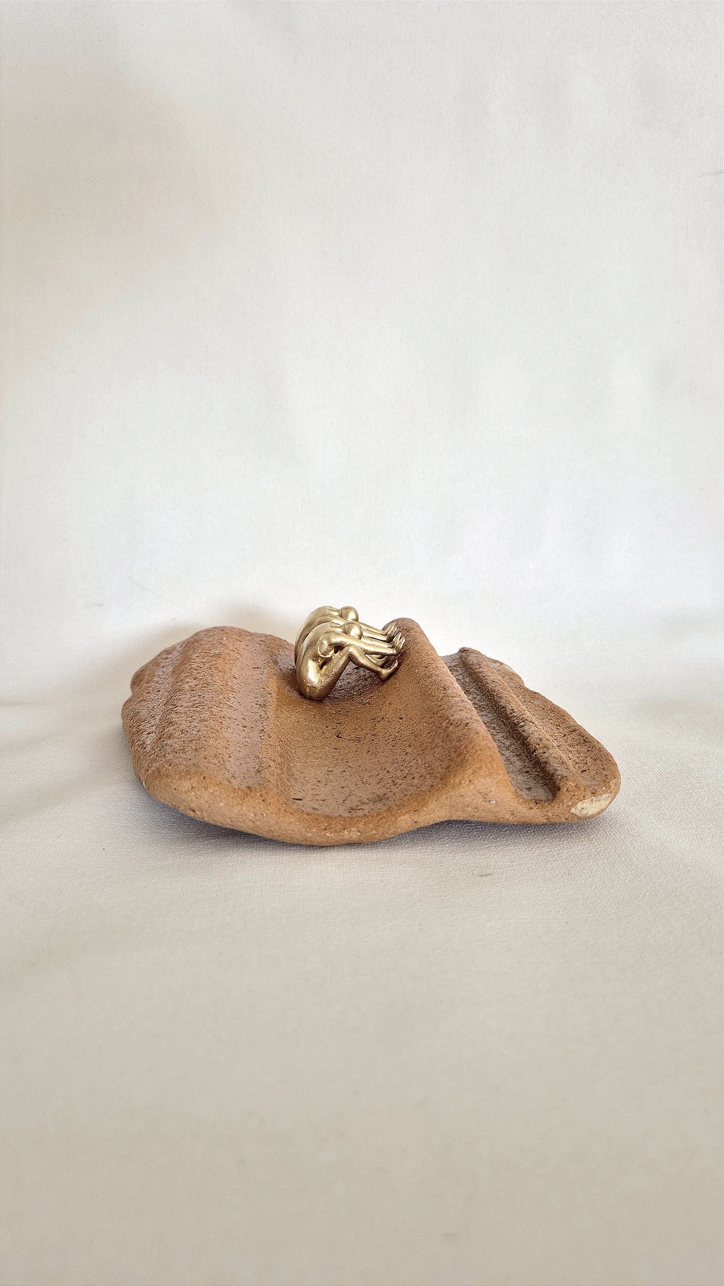 Obra que faz parte da série TELHA, TETO, AFETO. Uma série de obras originais e únicas, criadas a partir da ressignificação de matérias encontradas nas areias do litoral do Sul do Brasil. E esculturas que, em seus processos de produção, apresentaram algum defeito. Uma série que fala de reaproveitamento, se torna um ato de transformar e provocar uma nova perspectiva sobre descartes e pedaçoes de lares que são trazidos pelos mares.