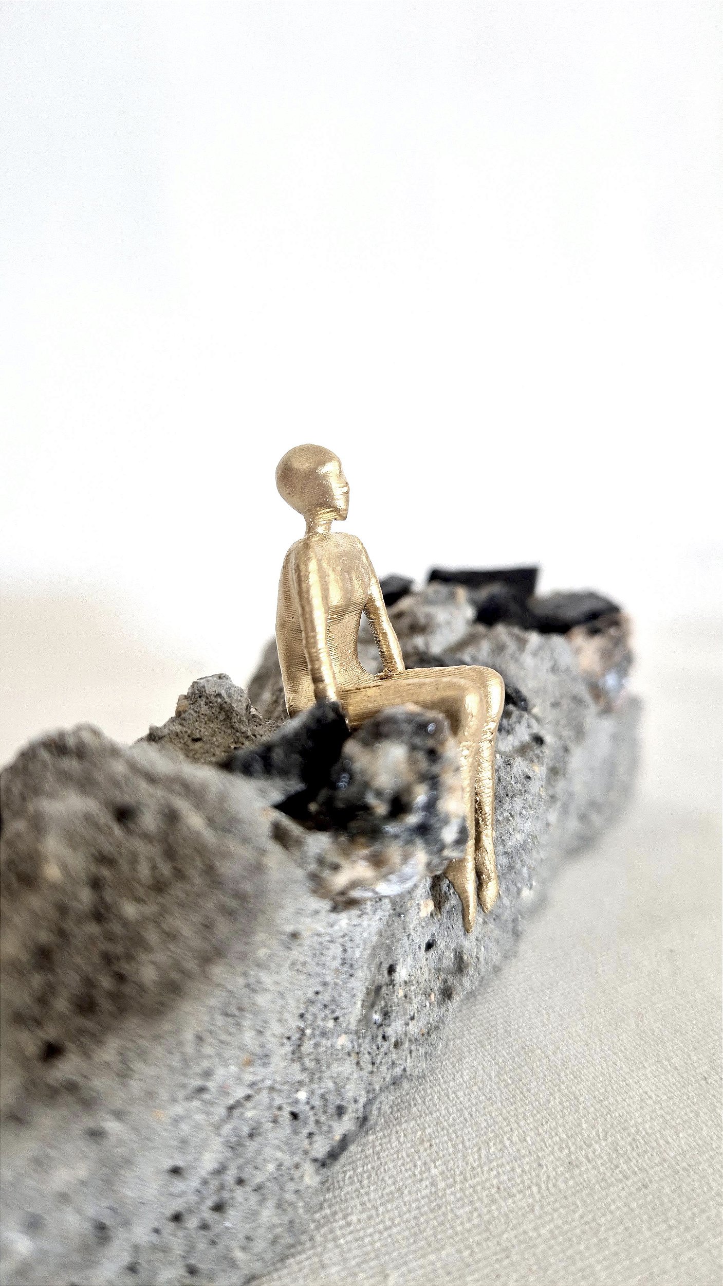 pedaço de concreto com pedras e sobreposição de mergulhadora em pose "contemplação" em PLA com acabamento dourado
