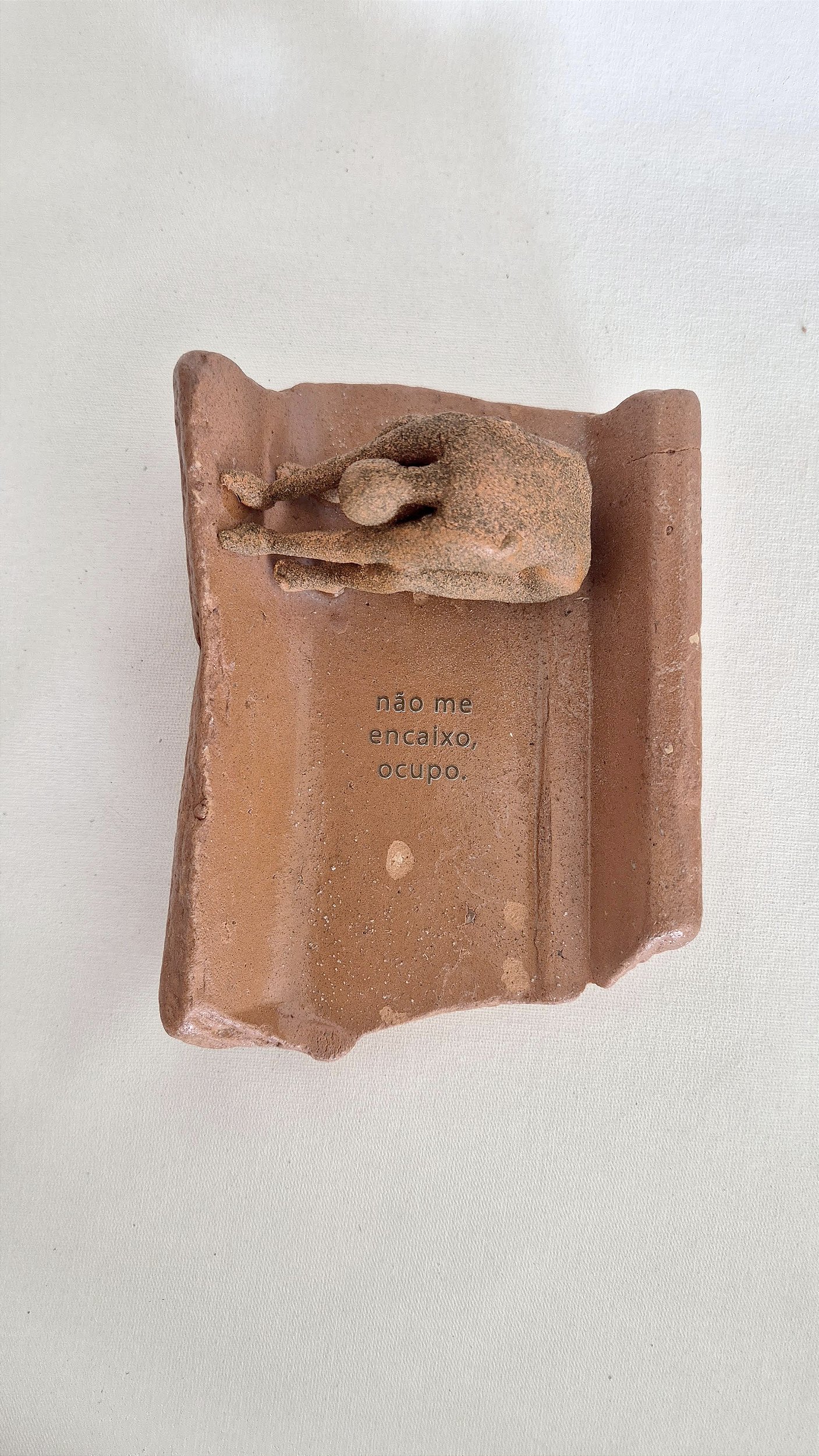 Obra que faz parte da série TELHA, TETO, AFETO. Uma série de obras originais e únicas, criadas a partir da ressignificação de matérias encontradas nas areias do litoral do Sul do Brasil. E esculturas que, em seus processos de produção, apresentaram algum defeito. Uma série que fala de reaproveitamento, se torna um ato de transformar e provocar uma nova perspectiva sobre descartes e pedaçoes de lares que são trazidos pelos mares.