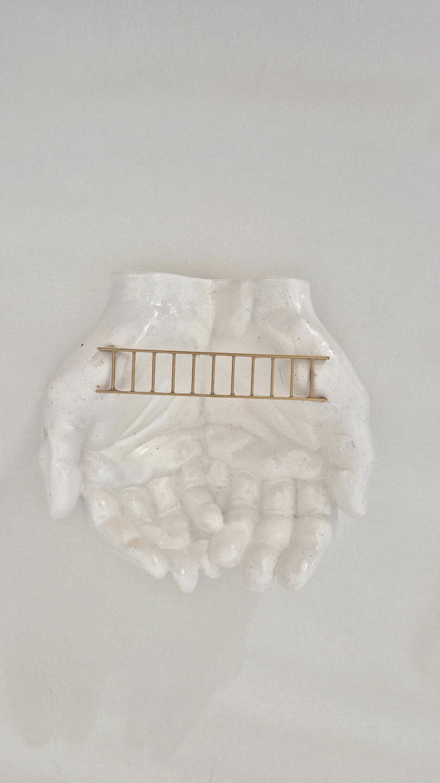 mão de gesso branco com aplicação de escultura dourada
