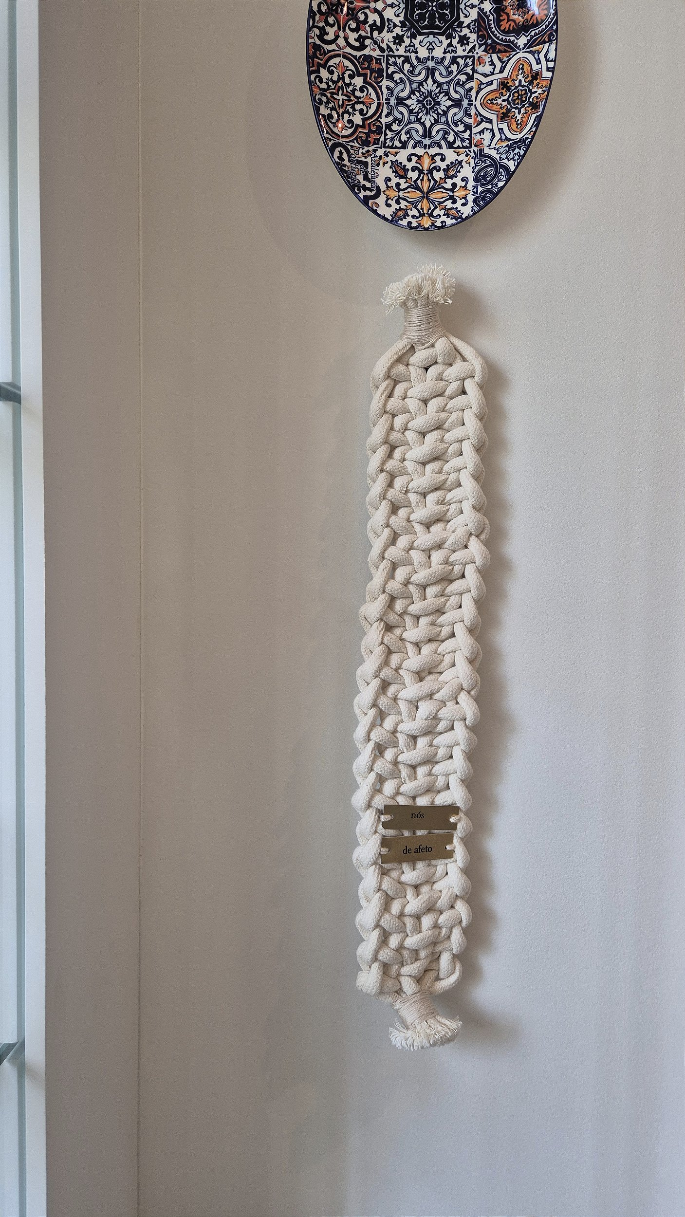 diferentes modelos de nós, em corda de algodão cru, para você apoiar sobre estantes e mesas de centro, ou pendurar na parede. Obras versáteis que compõe diferentes ambientes e entre si também. Nós colecionáveis cheios de poesia em pequenas placas metálicas douradas. Cada nó tem 40cm de comprimento.