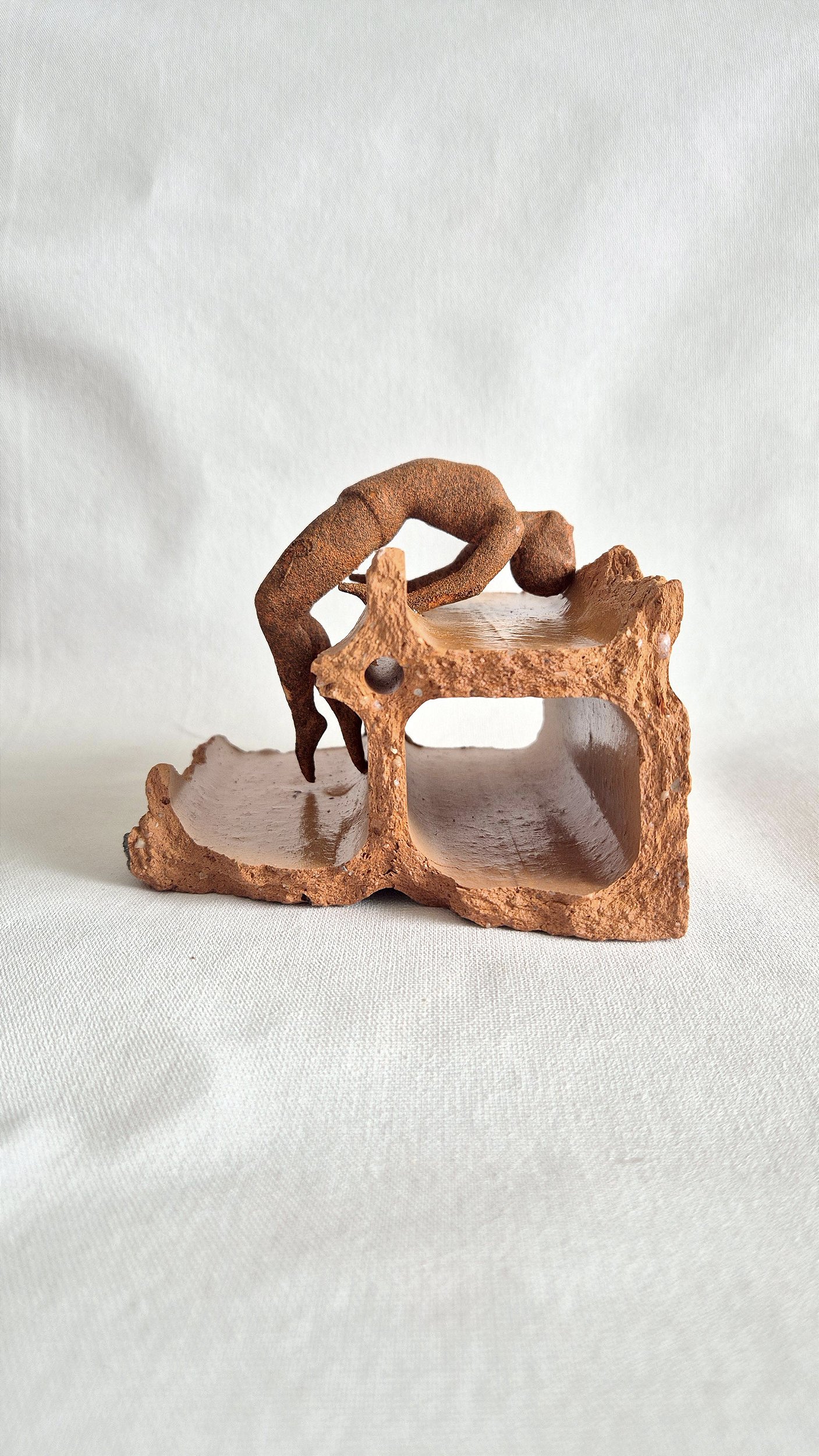 Obra que faz parte da série TELHA, TETO, AFETO. Uma série de obras originais e únicas, criadas a partir da ressignificação de matérias encontradas nas areias do litoral do Sul do Brasil. E esculturas que, em seus processos de produção, apresentaram algum defeito. Uma série que fala de reaproveitamento, se torna um ato de transformar e provocar uma nova perspectiva sobre descartes e pedaçoes de lares que são trazidos pelos mares.