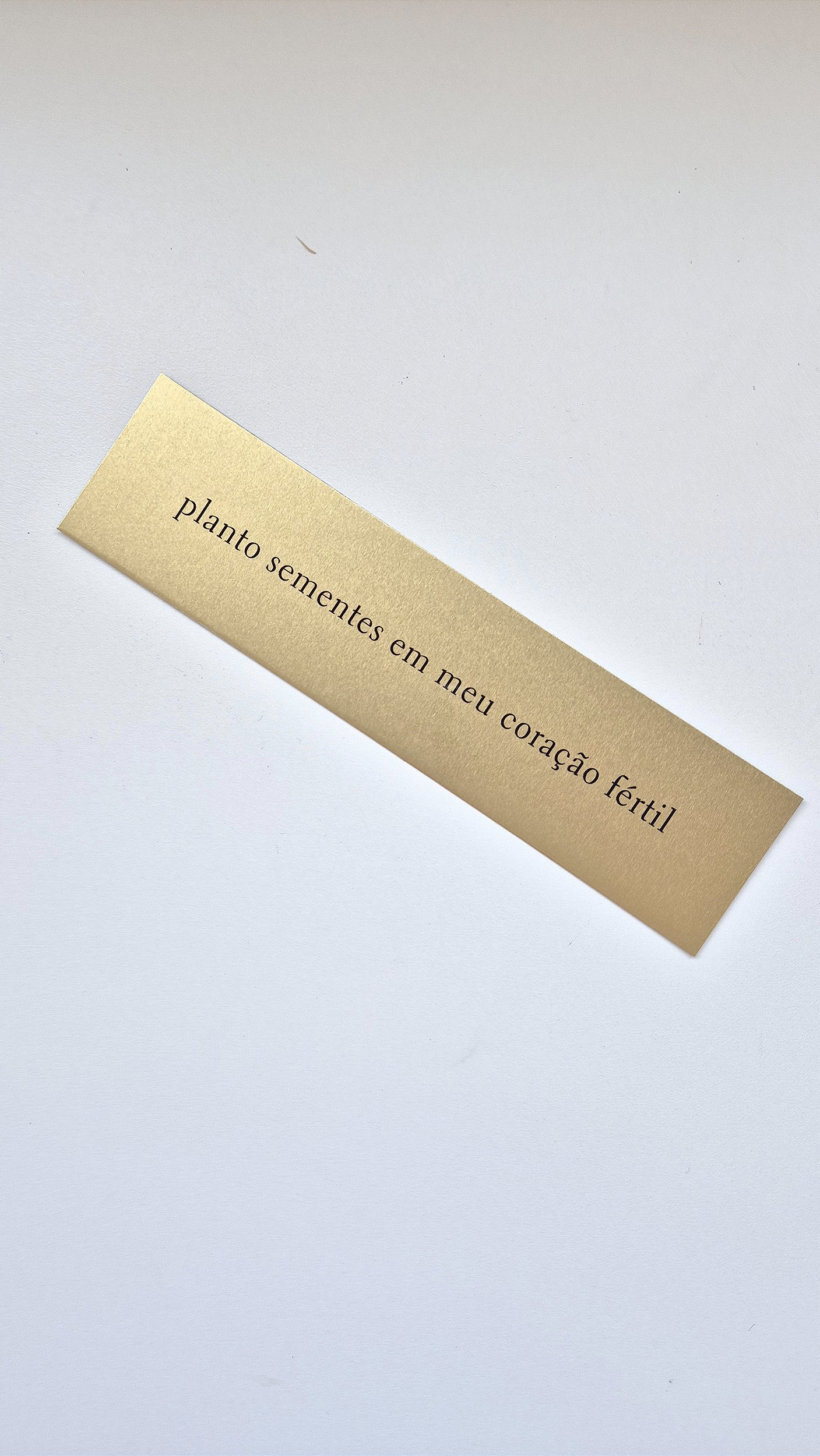 lâmina de alumínio com fundo dourado e impressão de poesia em preto.