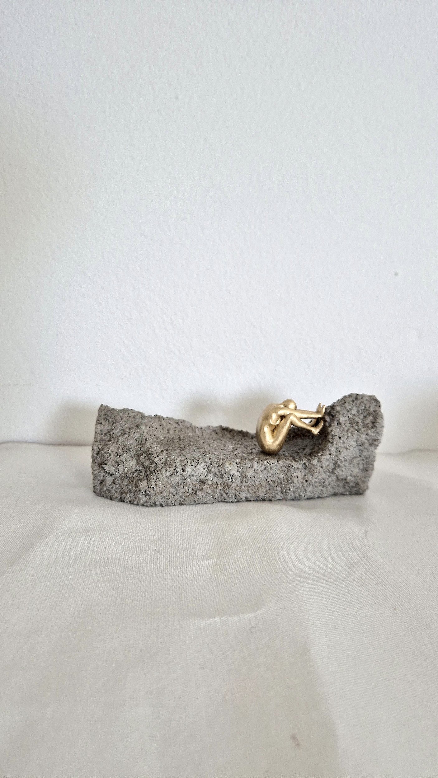 pedaço de concreto com sobreposição de mergulhadora em resina com acabamento manual em dourado