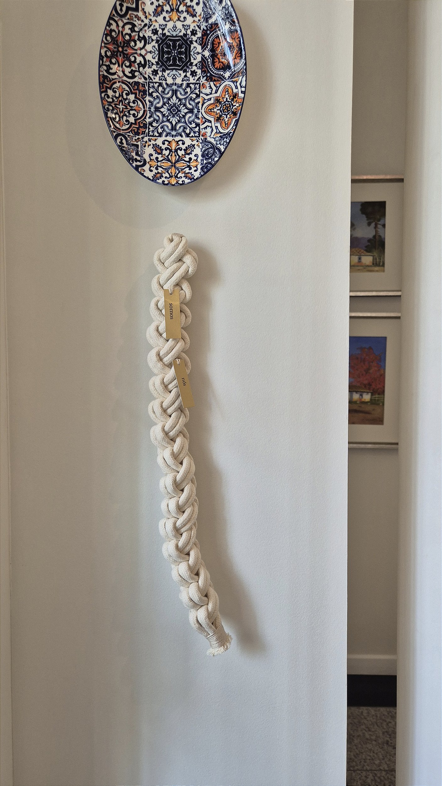 diferentes modelos de nós, em corda de algodão cru, para você apoiar sobre estantes e mesas de centro, ou pendurar na parede. Obras versáteis que compõe diferentes ambientes e entre si também. Nós colecionáveis cheios de poesia em pequenas placas metálicas douradas. Cada nó tem 40cm de comprimento.
