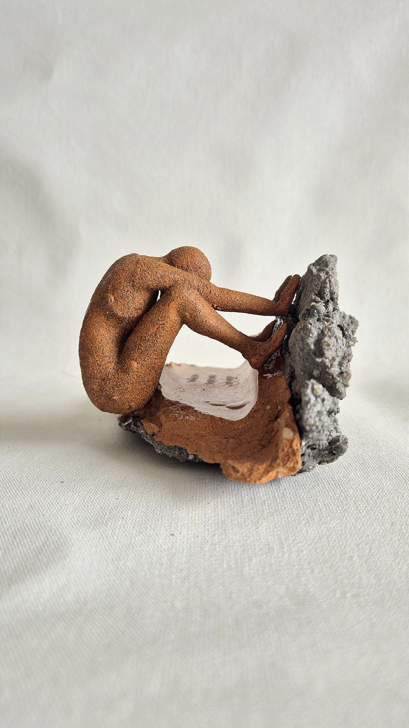Obra que faz parte da série TELHA, TETO, AFETO. Uma série de obras originais e únicas, criadas a partir da ressignificação de matérias encontradas nas areias do litoral do Sul do Brasil. E esculturas que, em seus processos de produção, apresentaram algum defeito. Uma série que fala de reaproveitamento, se torna um ato de transformar e provocar uma nova perspectiva sobre descartes e pedaçoes de lares que são trazidos pelos mares.