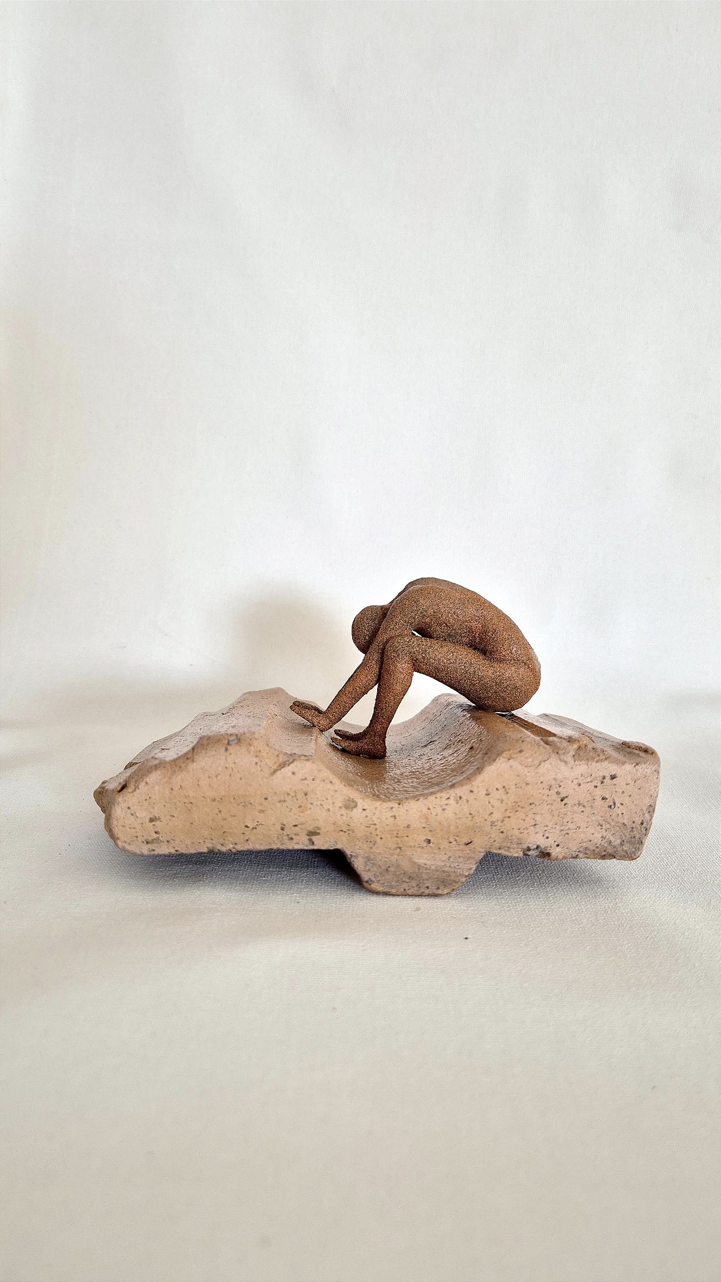 Obra que faz parte da série TELHA, TETO, AFETO. Uma série de obras originais e únicas, criadas a partir da ressignificação de matérias encontradas nas areias do litoral do Sul do Brasil. E esculturas que, em seus processos de produção, apresentaram algum defeito. Uma série que fala de reaproveitamento, se torna um ato de transformar e provocar uma nova perspectiva sobre descartes e pedaçoes de lares que são trazidos pelos mares.